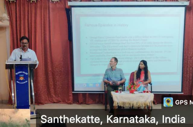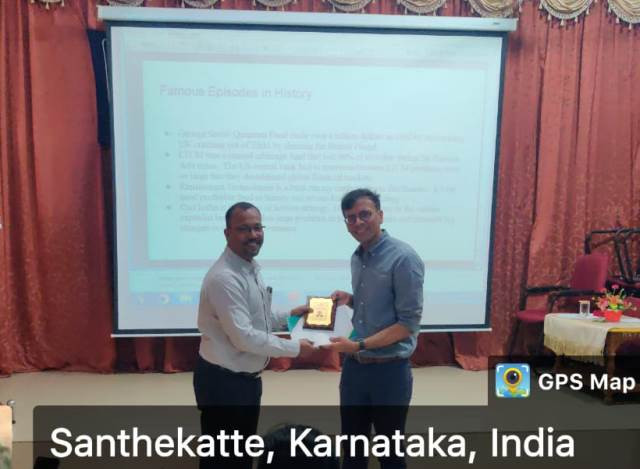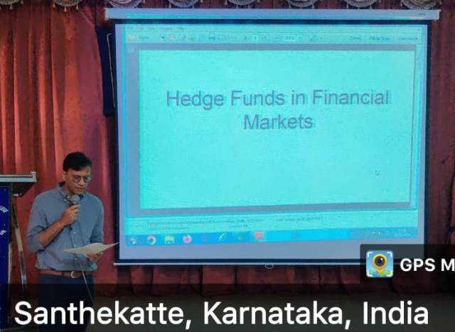 Then it was the beginning of the first session. Mr Nithin Kumar, the Senior Portfolio Manager, M/s Lurion Capital was briefly introduced to the audience by Prof Chaitra K and escorted him to the podium to take charge of the exhaustive lively presentation. He specially focussed on Hedge Funds and how they are different from other investments especially mutual funds etc. He also clarified the doubts and answered the questions raised by the participants.