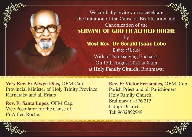 xl. On 15th August, 2021, Bishop of Udupi, Rt. Rev Dr Gerald Isaac Lobo, initiates the Cause of Beatification & Canonization of ‘Servant of God Fr Alfred Roche OFM Cap.’ during the Thanks-giving High Mass celebrated in the Holy Family Church, Brahmmavar, at 8.00 am in the presence of multitudes of faithful.