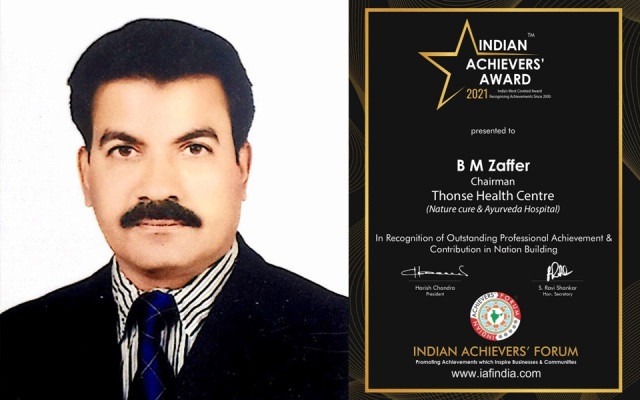 Thonse/New Delhi, Nov 2, 2021: Chairman of Thonse Health Centre BM Zaffer has been awarded the Indian Achievers’ Award 2021 by the Indian Achievers’ Forum.