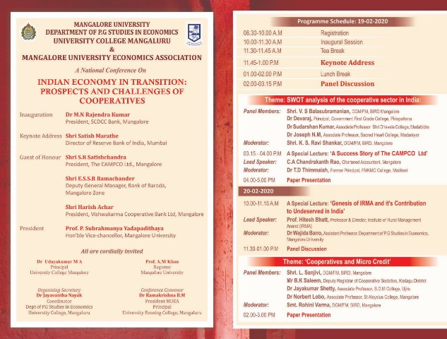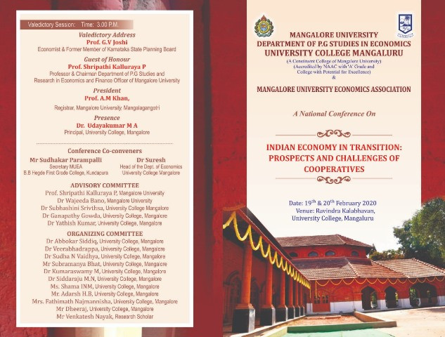 Department of PG Studies in Economics University College Mangaluru and Mangalore University Economics Association(MUEA) proposed to organize a National Conference with a theme " Indian Economy in Transition: Prospects and Challenges of Cooperatives" on 19th and 20th February 2020.