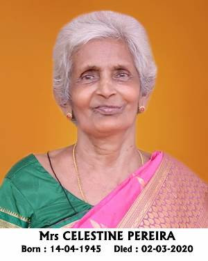 Celestine Juliana Pereira (75), wife of the late Abraham Pereira, mother of Herry, Mary Leena, Fr Ronnie, Henry, Joseph John and Rita, passed away on March 2, 2020.
