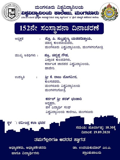 ಮಂಗಳೂರು: ಮಂಗಳೂರು ವಿಶ್ವವಿದ್ಯಾನಿಲಯದ ಸಹಯೋಗದೊಂದಿಗೆ ವಿಶ್ವವಿದ್ಯಾನಿಲಯ ಕಾಲೇಜು ಮಂಗಳೂರು ತನ್ನ 152 ನೇ ಸಂಸ್ಥಾಪನಾ ದಿನಾಚರಣೆಯನ್ನು ಸೆಪ್ಟೆಂಬರ್ 19 (ಶನಿವಾರ) ರಂದು ಕಾಲೇಜಿನ ರವೀಂದ್ರ ಕಲಾಭವನದಲ್ಲಿ ಬೆಳಿಗ್ಗೆ 10.30 ಕ್ಕೆ ಆಯೋಜಿಸಿದೆ. ಹಾವೇರಿಯ ಕರ್ನಾಟಕ ಜಾನಪದ ವಿಶ್ವವಿದ್ಯಾನಿಲಯದ ವಿಶ್ರಾಂತ ಕುಲಪತಿ ಪ್ರೊ. ಚಿನ್ನಪ್ಪ ಗೌಡ ಕಾರ್ಯಕ್ರಮದ ಮುಖ್ಯ ಅತಿಥಿಯಾಗಿರಲಿದ್ದಾರೆ. ಮಂಗಳೂರು ವಿಶ್ವವಿದ್ಯಾನಿಲಯದ ಕುಲಪತಿ ಪ್ರೊ. ಪಿ ಸುಬ್ರಹ್ಮಣ್ಯ ಯಡಪಡಿತ್ತಾಯ ಅವರು ಕಾರ್ಯಕ್ರಮದ ಅಧ್ಯಕ್ಷತೆ ವಹಿಸಿಕೊಳ್ಳಲಿದ್ದಾರೆ. ವಿಶ್ವವಿದ್ಯಾನಿಲಯದ ಕುಲಸಚಿವ ಕೆ. ರಾಜು ಮೊಗವೀರ, ವಿವಿ ಕಾಲೇಜಿನ ಹಳೆ ವಿದ್ಯಾರ್ಥಿ ಸಂಘದ ಅಧ್ಯಕ್ಷ ಕರ್ನಲ್ ಶರತ್ ಭಂಡಾರಿ ಉಪಸ್ಥಿತರಿರಲಿದ್ದಾರೆ, ಎಂದು ಕಾಲೇಜಿನ ಪ್ರಾಂಶುಪಾಲ ಡಾ. ಉದಯಕುಮಾರ್ ಎಂ ಎ, ಪತ್ರಿಕಾ ಪ್ರಕಟಣೆಯಲ್ಲಿ ತಿಳಿಸಿದ್ದಾರೆ.