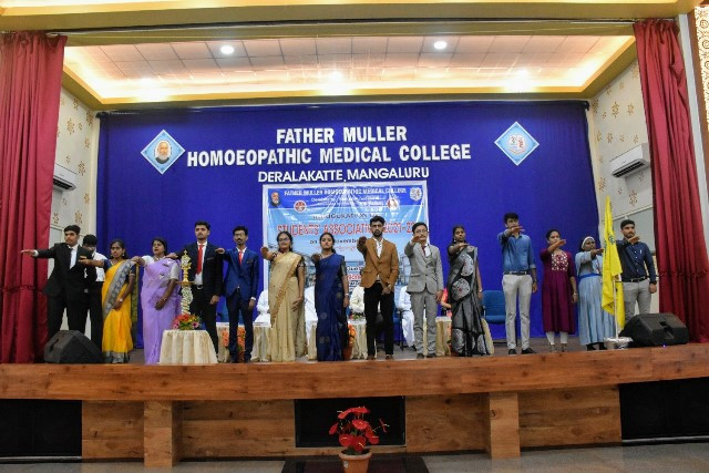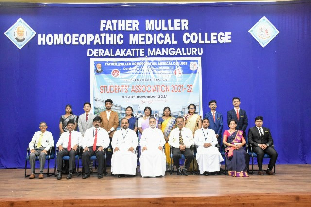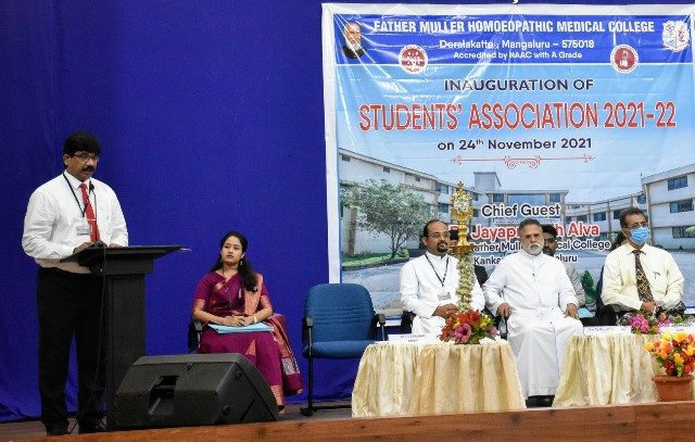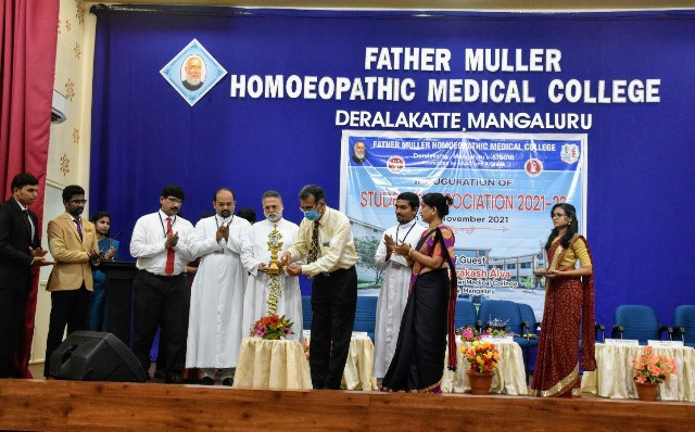 Mr Madhavaram Noah Sharon, Former President, Student Association 2020-2021escorted the dignitaries on to the dais Rev. Fr Richard Aloysius Coelho Director, Father Muller Charitable Institutions, Dr Jayaprakash Alva Dean, Father Muller Medical College & Chief Guest for the event, Rev. Fr Roshan Crasta Administrator, Father Muller Homoeopathic Medical College & Hospital, Rev. Fr Rohan Dias, Assistant Administrator, Father Muller Homoeopathic Medical College & Hospital, Dr E S J Prabhu Kiran, Principal, Father Muller Homoeopathic Medical College, Dr Vilma Meera D’Souza, Vice Principal & Staff Advisor, Students’ Association, Father Muller Homoeopathic Medical College.