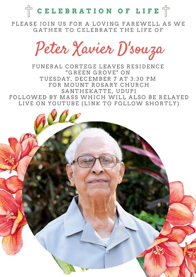 Peter Xavier D’Souza (94), ex-Choir Master of Mount Rosary Church Kallianpur and ex Compounder of Goretti Hospital, husband of Celine D’Souza, father of Joel John D’Souza / Jasmin D’Souza, Sr Santhosh D’Souza SRA, Jossius Engelbert D Souza (Joe) / Janet D’Souza, Jovita M Fernandes / Joseph M Fernandes (Joe), Joyline M Gonsalves / John Kiran Gonsalves, Joyston Francis D’Souza / Reema Lolita Lobo, grandfather of Andrea & Alex D Souza, Arlene D Souza, Aquin Fernandes/Ansel, Aaron Gonsalves/ Adler & Andre D’Souza, passed away on December 4, 2021.