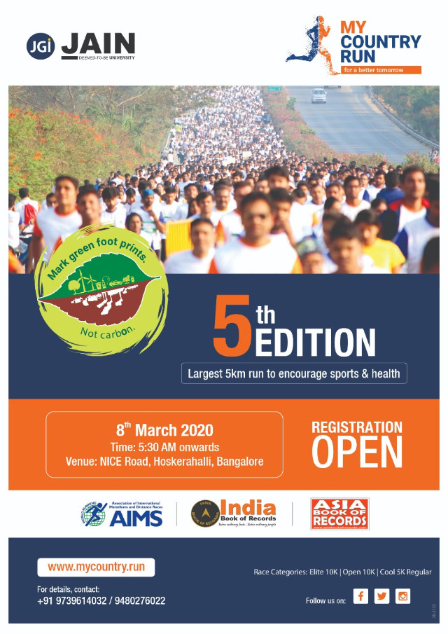 Speaking on this momentous fifth edition of the run the spokesperson, Col (Hony.) Dr. N Sundararajan, Vice Chancellor, Jain (Deemed-to-be University) said, “As we start gearing up for the fifth edition of My Country Run, I must say I am extremely delighted by the acceptance and encouragement we have received for our previous editions. With our motto of #RunForABetterTomorrow this year we are expecting a greater participation and awareness about health & fitness.