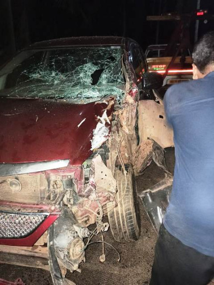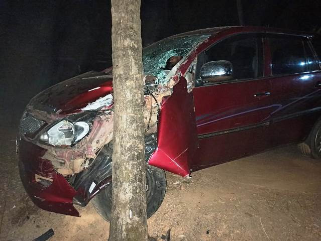 The students in a rented Innova car where on their way back to Manipal after sight-seeing to Hoode/Bengre. They were rushing back to their hostel as it was too late and at the Kambal Thota turn the car got skidded and hit the coconut tree. Police who arrived at the spot toed away the car.
