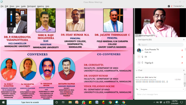 ಇದು ಮಂಗಳೂರು ವಿಶ್ವವಿದ್ಯಾನಿಲಯದ ಅಡಿಯಲ್ಲಿ ಹಿಂದಿ ವಿಭಾಗ ನಡೆಸಿದ ಮೊದಲ ರಾಷ್ಟ್ರ ಮಟ್ಟದ ವೆಬಿನಾರ್ ಆಗಿದೆ. ವಿಶ್ವವಿದ್ಯಾನಿಲಯ ಕಾಲೇಜಿನ ಸ್ನಾತಕೋತ್ತರ ವಿಭಾಗದ ಸಂಯೋಜಕಿ ಡಾ. ಸುಮಾ ಟಿ. ರೋಡನ್ನವರ್, ಸ್ನಾತಕ ವಿಭಾಗದ ಮುಖ್ಯಸ್ಥೆ ಡಾ. ನಾಗರತ್ನ ಎನ್. ರಾವ್, ಫೀಲ್ಡ್ ಮಾರ್ಷಲ್ ಕೆ.ಎಂ ಕಾರ್ಯಪ್ಪ ಕಾಲೇಜಿನ ಹಿಂದಿ ವಿಭಾಗದ ಮುಖ್ಯಸ್ಥ ಡಾ. ಶ್ರೀಧರ ಹೆಗ್ಡೆ, ಸಹ ಪ್ರಾಧ್ಯಾಪಕ ಬಿಸ್ತಪ್ಪ ತಲ್ವಾರ್ ಕಾರ್ಯಕ್ರಮ ನಡೆಸಿಕೊಟ್ಟರು.