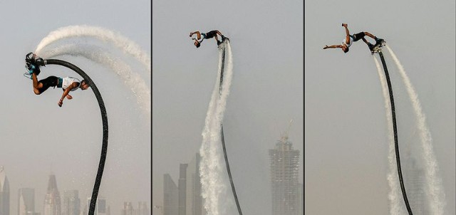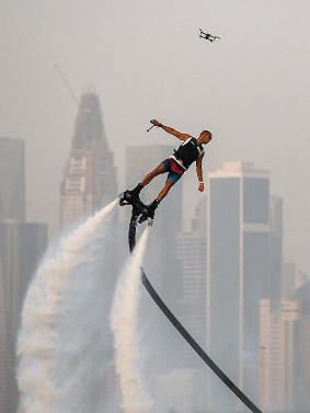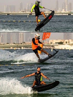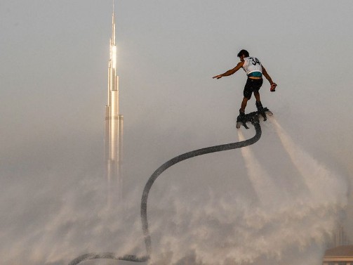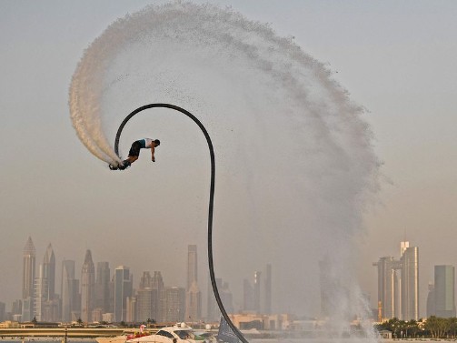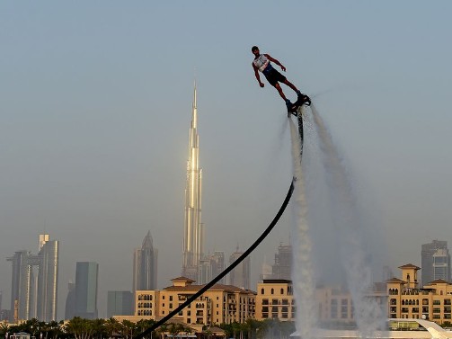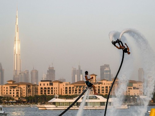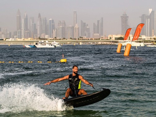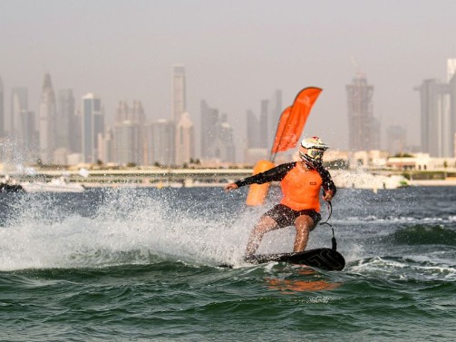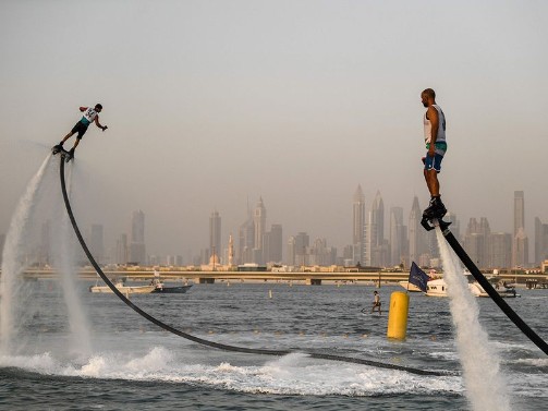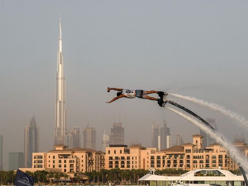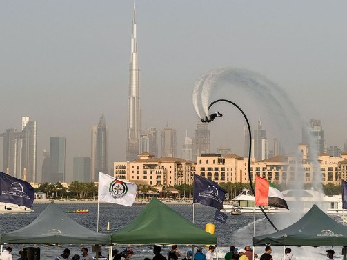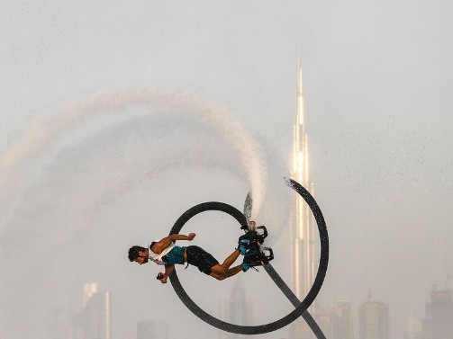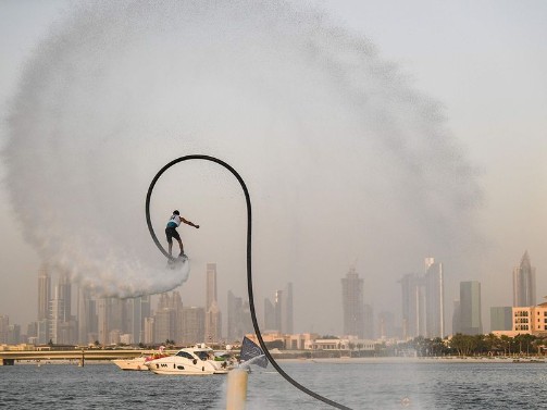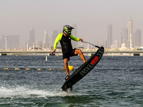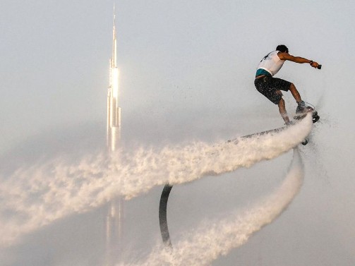 Participant competing in the flyboard competition during the Dubai Watersports Summer Week at Al Shorooq beach.