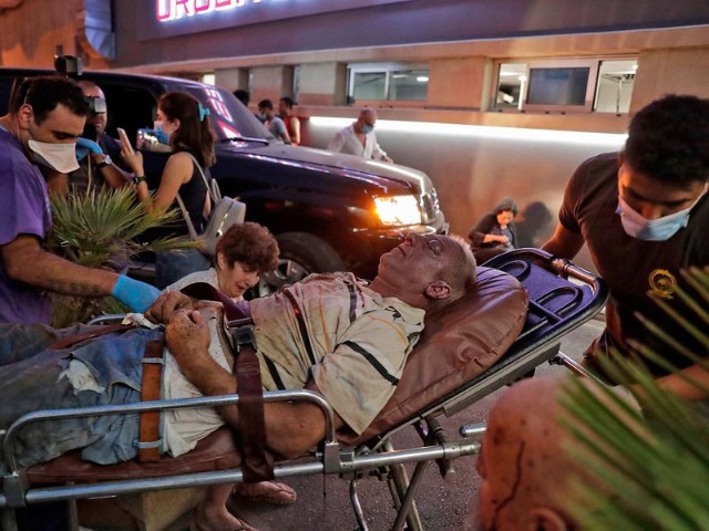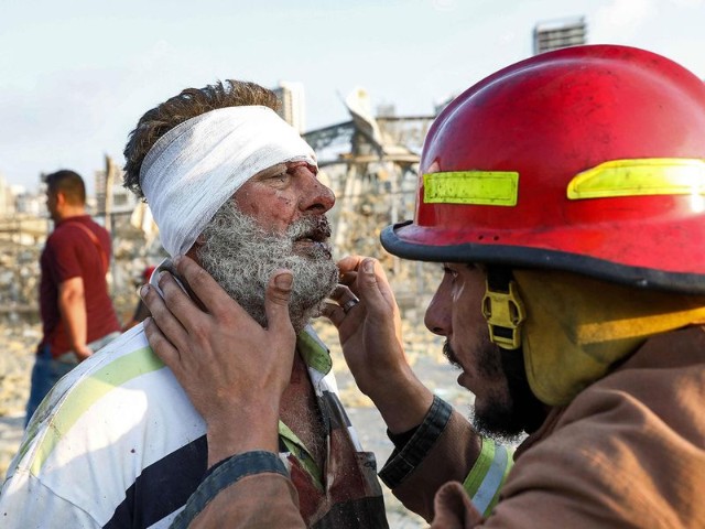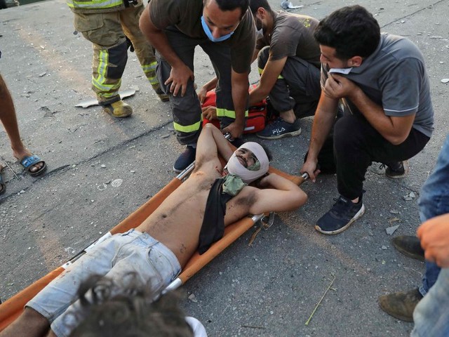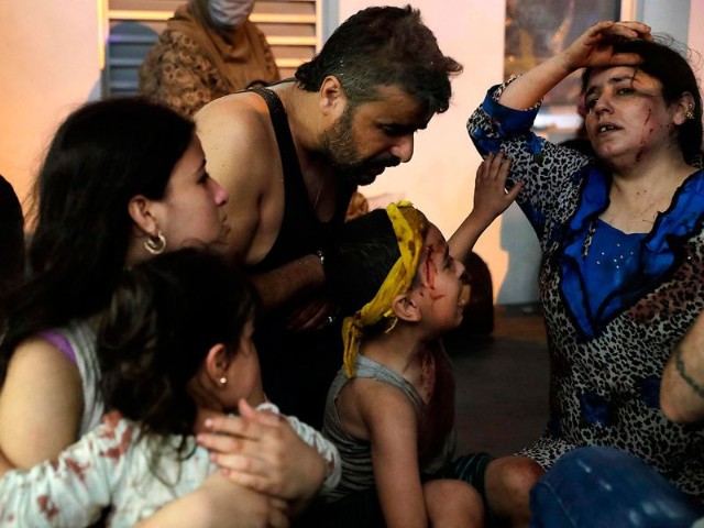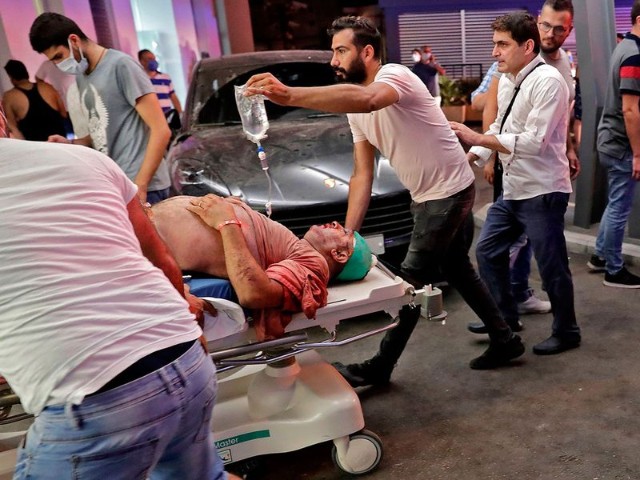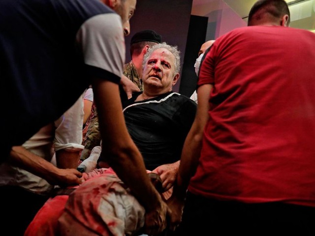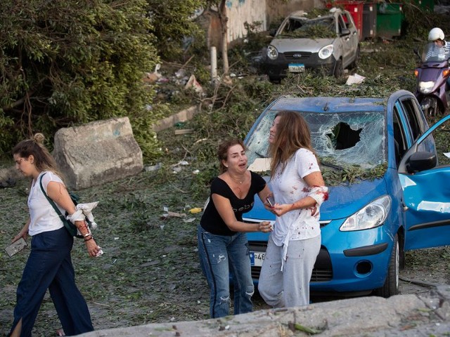 Injured stand after of a massive explosion in Beirut, Lebanon.
