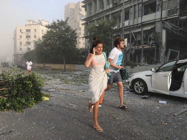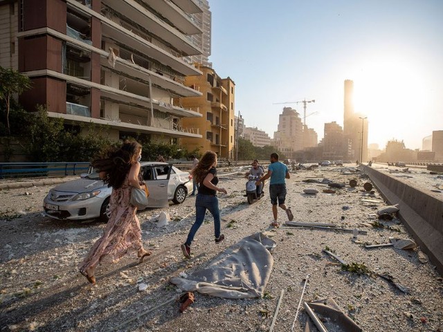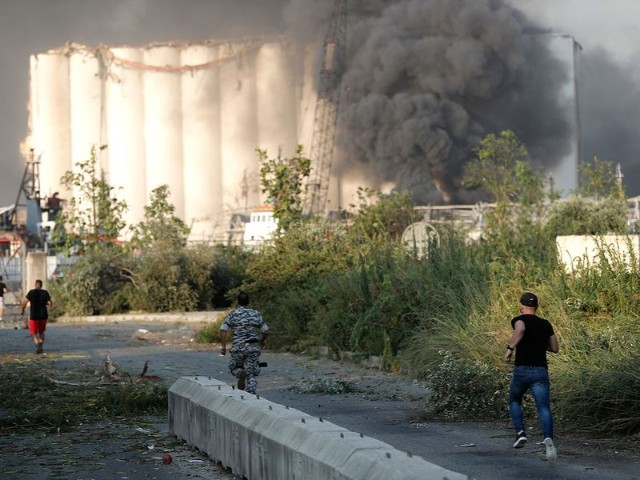 Lebanese security officers run towards the scene of the blasts, trying to help the wounded escape. Two explosions tore through the capital of Lebanon on Tuesday.