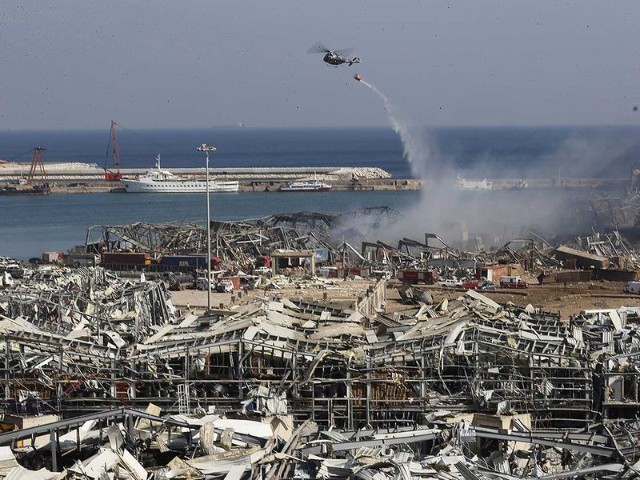 A Lebanese army helicopter throw water at the scene where an explosion hit the seaport of Beirut, Lebanon