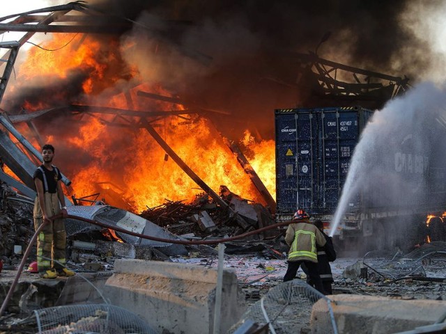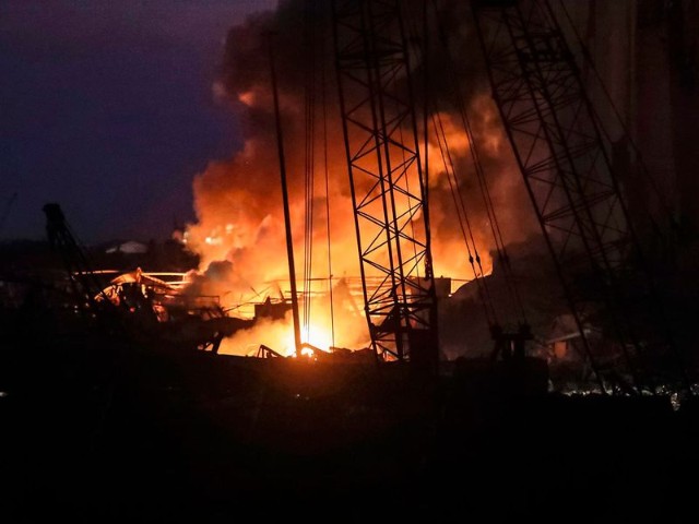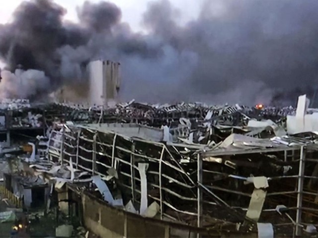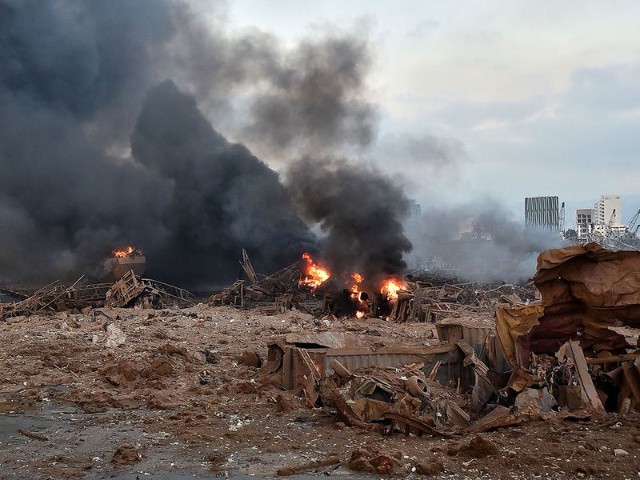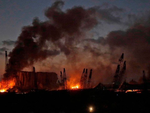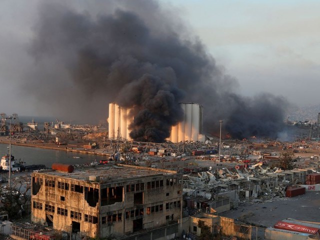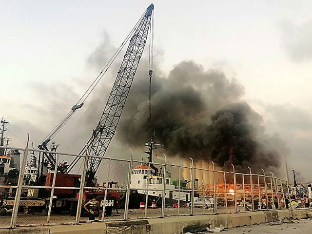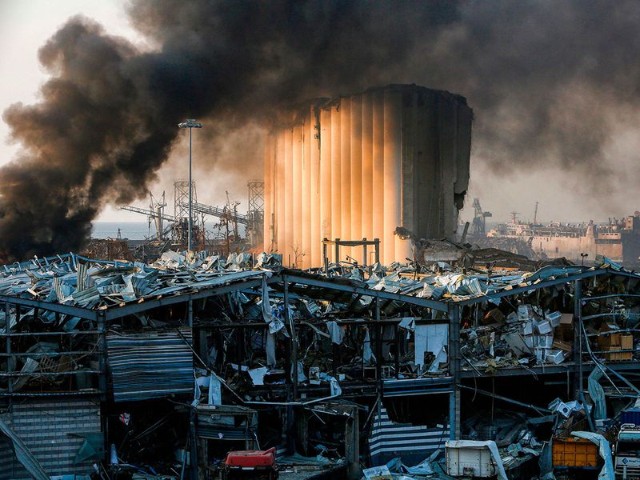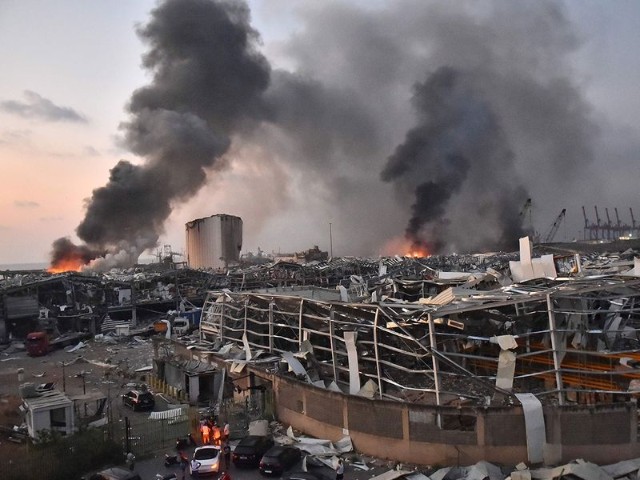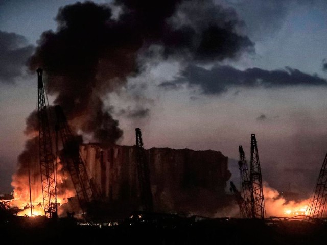 Fires burning at the port of Lebanon’s capital Beirut with its cranes in the aftermath of a massive explosion.