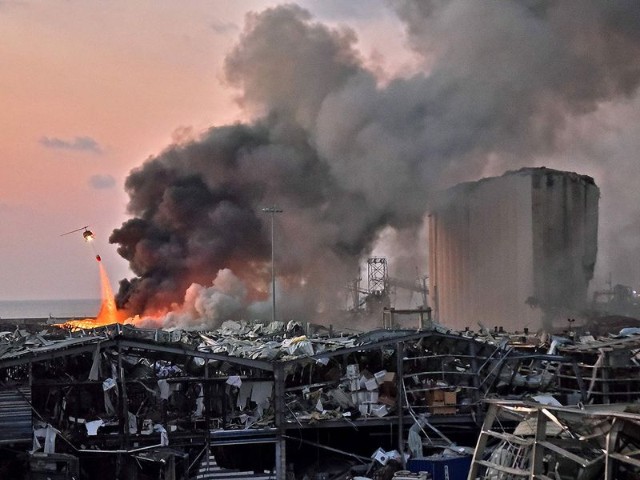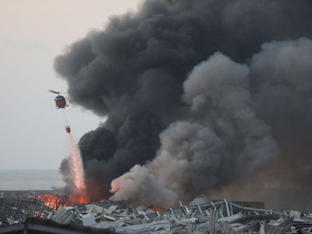 A helicopter puts out a fire at the scene of an explosion at the port of Lebanon’s capital Beirut.