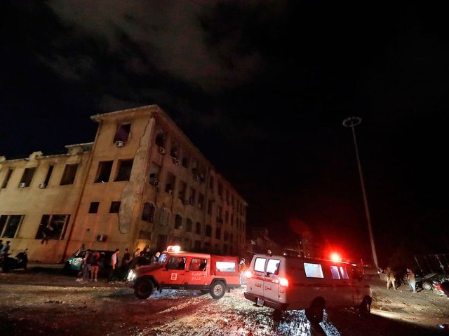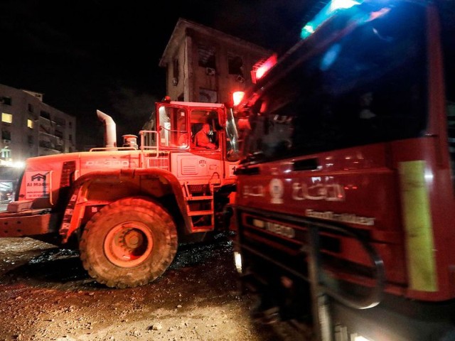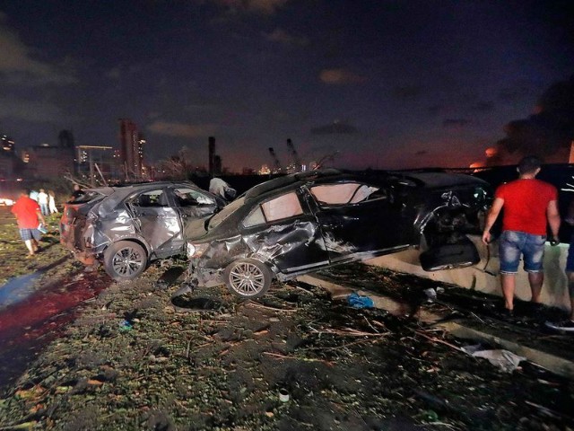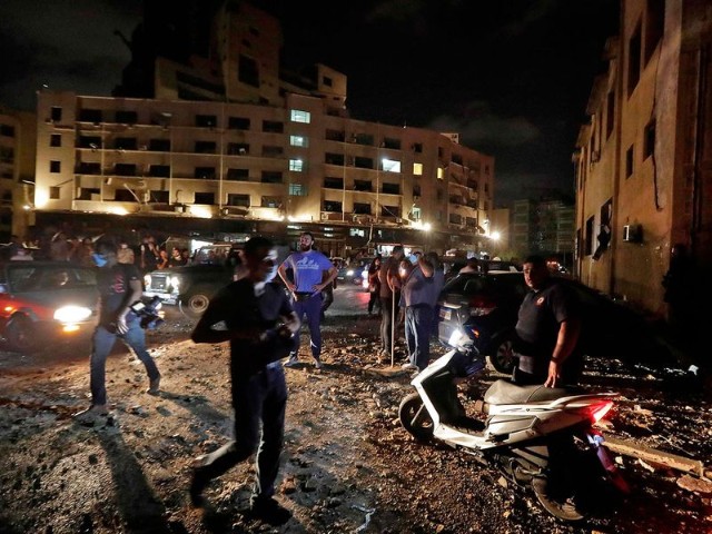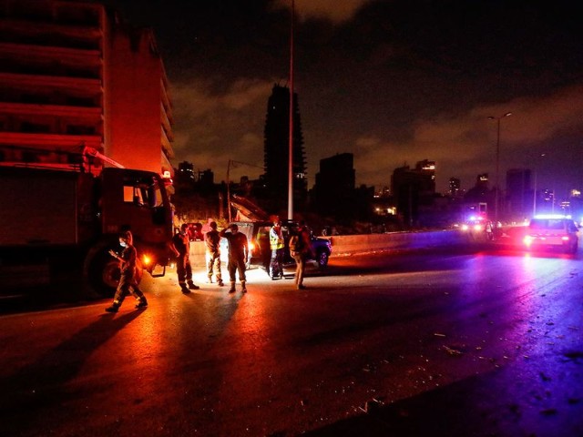 Lebanese civil defence vehicels are seen at the scene of the explosion.