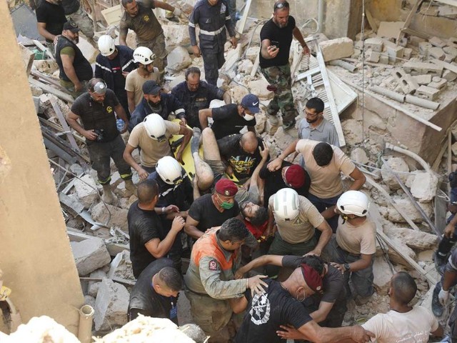 A survivor is taken out of the rubble after a massive explosion in Beirut, Lebanon.