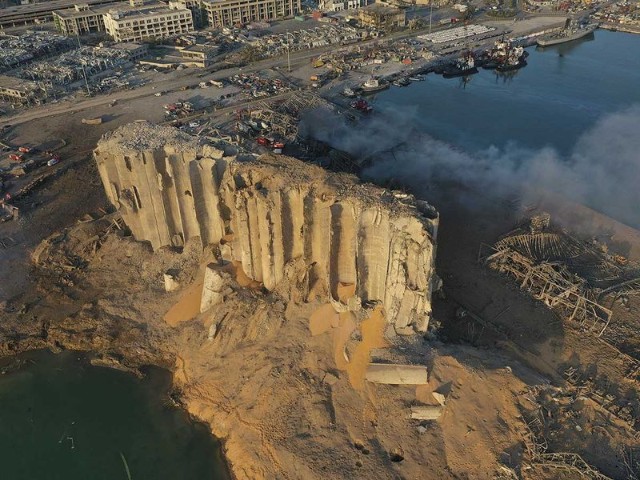 The destroyed silo sits in rubble and debris after an explosion at the seaport of Beirut, Lebanon
