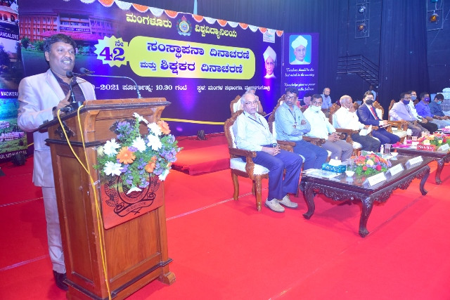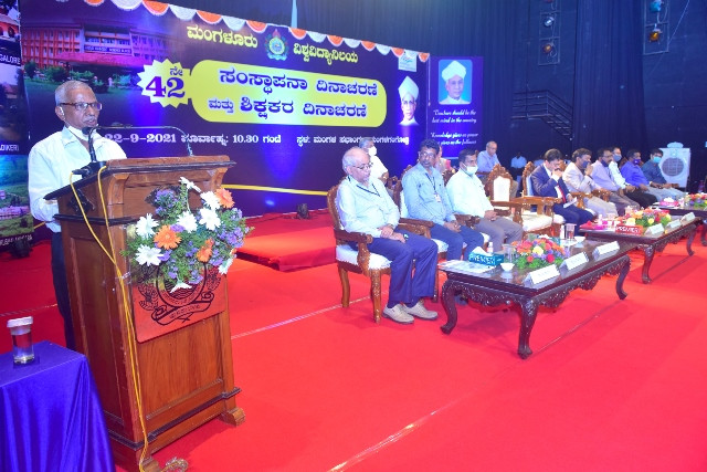 ಮಂಗಳೂರು ವಿಶ್ವವಿದ್ಯಾನಿಲಯದ ʼ,ಮಂಗಳಾ ಸಭಾಂಗಣʼ ದಲ್ಲಿ ಬುಧವಾರ ನಡೆದ 42 ನೇ ಸಂಸ್ಥಾಪನಾ ದಿನಾಚರಣೆ ಮತ್ತು ಶಿಕ್ಷಕರ ದಿನಾಚರಣೆಯ ಅಧ್ಯಕ್ಷತೆ ವಹಿಸಿ ಮಾತನಾಡಿದ ಅವರು, ಧರ್ಮಸ್ಥಳದ ಧರ್ಮಾಧಿಕಾರಿ ಡಾ. ವೀರೇಂದ್ರ ಹೆಗ್ಗಡೆಯವರ ಸಲಹೆಯಂತೆ ಮಂಗಳೂರು ವಿಶ್ವವಿದ್ಯಾನಿಲಯದ ಕ್ಯಾಂಪಸ್ನಲ್ಲಿ ʼತುಳುಗ್ರಾಮʼ ವನ್ನು ಮುಂದಿನ ಸಂಸ್ಥಾಪನಾ ದಿನಾಚರಣೆಯ ಒಳಗೆ ಅಭಿವೃದ್ಧಿಪಡಿಸಲಾಗುವುದು. ವಿಶ್ವವಿದ್ಯಾನಿಲಯದ ದ್ವಿಮುಖ ರಸ್ತೆಯ ಎರಡು ಬದಿ ಕಲಾಕೃತಿಗಳನ್ನು ನಿರ್ಮಿಸಲಾಗುವುದು, ಎಂದರು.