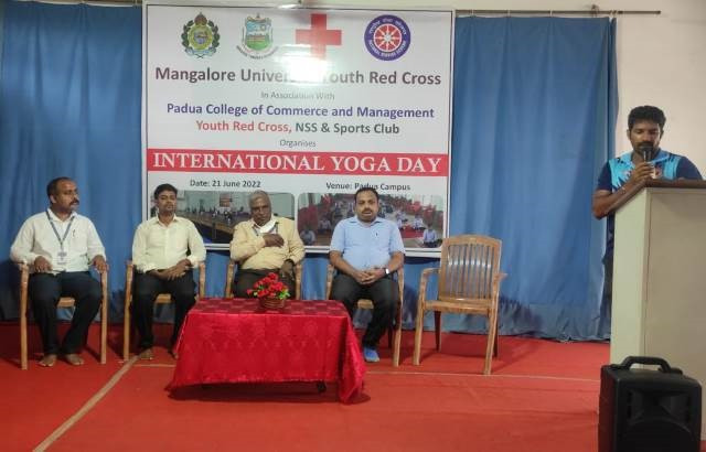 ಮುಖ್ಯ ಅತಿಥಿ, ವಿಶ್ವವಿದ್ಯಾನಿಲಯದ ಯೋಗ ವಿಜ್ಞಾನ ವಿಭಾಗದ ಯೋಗ ತರಬೇತುದಾರ ಡಾ. ರಂಗಪ್ಪ, ಯೋಗದ ಹಿನ್ನೆಲೆ ಮತ್ತು ಅದರ ಅಗತ್ಯತೆಯನ್ನು ತಿಳಿಸಿಕೊಟ್ಟರು. ಕಾಲೇಜಿನ ಪ್ರಾಂಶುಪಾಲ ಪ್ರೊ. ರಾಜನ್ ವಿ. ಎನ್ , ಯೋಗದಿಂದ ಆರೋಗ್ಯಕ್ಕೆ ಆಗುವ ಪ್ರಯೋಜನಗಳನ್ನು ತಿಳಿಸಿದರು. ವೇದಿಕೆಯಲ್ಲಿ ಯುವ ರೆಡ್ ಕ್ರಾಸ್, ಜೆ ಸಿ ಐ ಮಂಗಳೂರು ಇದರ ಪದಾಧಿಕಾರಿಗಳು ಉಪಸ್ಥಿತರಿದ್ದರು.