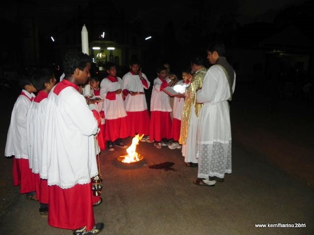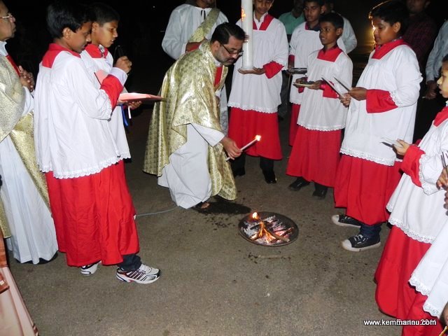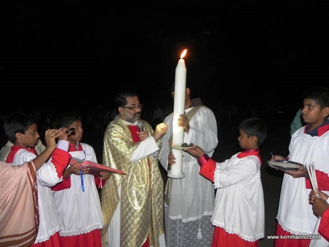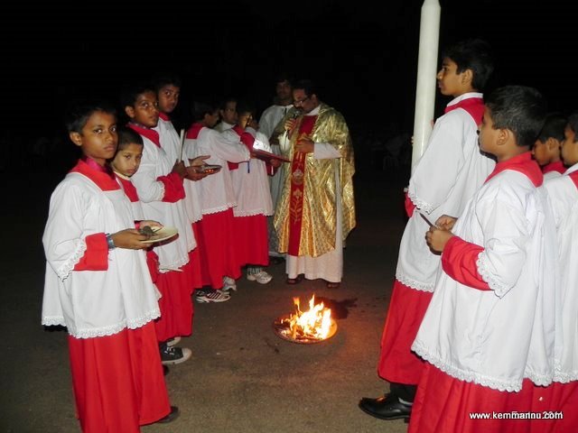 Parish priest Fr Philip Nerhi blessed the holy fire prior to the ceremony and lit the Pascal candle on the church grounds, began with prayers from the Holy Bible, he then embedded Five grains of incense in the candle encased in wax "nails" representing the five wounds of Jesus one in each hand, one in each foot, and the spear thrust into his side. Flame of the Paschal candle symbolizes Christ as light of the world and his presence in the midst of his people. Paschal candle is the largest candle in the worship space displayed symbols .The cross is the central symbol, The Greek letters alpha and omega signify that God is the beginning and the end taken from the Book of Revelation. The current year represents God’s presence here and now in the midst of the gathered worshipers. Then the blessed candle was taken to the alter preset for the Easter Vigil mass in the Mini hall stage. The open air seating arrangement was overwhelming as well as the sound system, chairs and the lighting facilitated the veneration comfortably for the parish community.