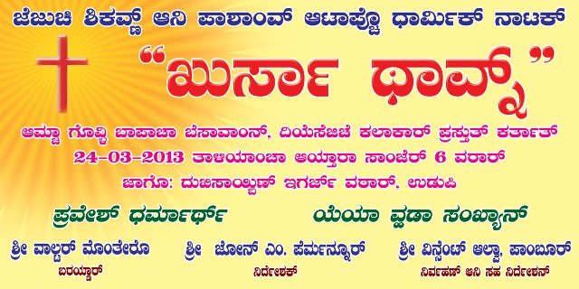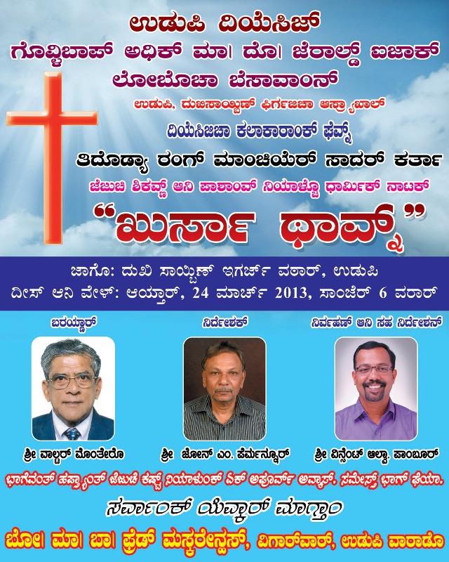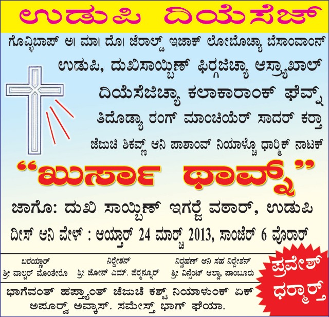 The Diocese of Udupi, with Blessings of our beloved Bishop, His Lordship Dr. Gerald Isaac Lobo, and under the auspices of Mother of Sorrows Church, Udupi will be presenting the emotive and spiritually inspiring Konkani Play“Khursa Thaun” (From the Cross) at Udupi church grounds on Palm Sunday, the 24th March 2013 at 6 p.m.