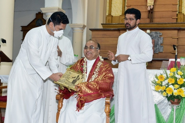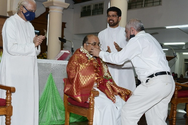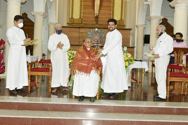As a token of love , Fr Joswin honoured him with a shawl ,He was garlanded by PPC vice-president David Pais,Memento was given by Fr Arun and Citation was presented by Fr William Barracas.