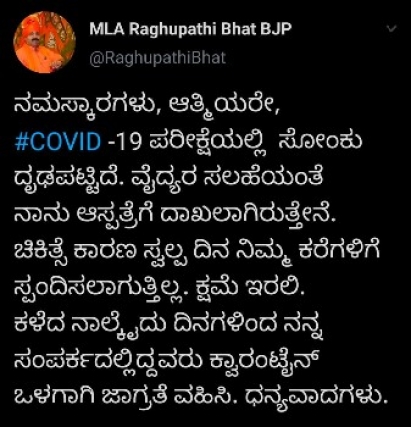 As per his twitter, MLA Raghupathy said, “I have tested positive for Covid-19, On the advice of doctors, I have gotten admitted to hospital. As I am under treatment, I will not be able to respond to calls from public for a few days. Forgive me”.