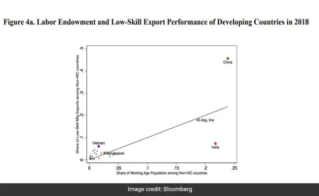 Consider first the exceptionalism of India’s growth. Bangladesh is doing well because it’s following the path of previous Asian tigers. Its slice of low-skilled goods exports is in line with its share of poor-country working-age population. Vietnam is punching slightly above its weight. But basically, both are taking a leaf out of China’s playbook. The People’s Republic held on to high GDP growth for decades by carving out for itself a far bigger dominance of low-skilled goods manufacturing than warranted by the size of its labor pool.