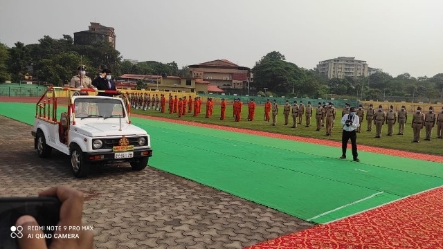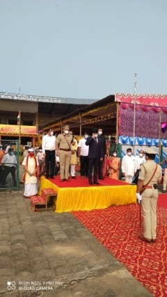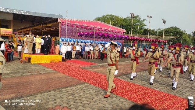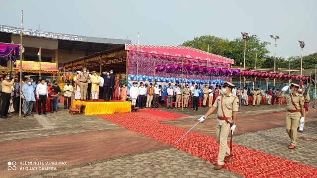 After the garland on the statue of Bhuvaneshwari statue, District Collector G. Jagadeesh hoisted the flag. The district collector then received the guard of honour from different wings of the police department. A wonderful march past performed by civil police, coastal guard, home guard, forest department, traffic police along with police brass band and othrs.