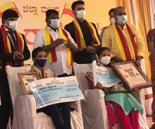 Spoorthi Ashoka Rathoda, a student of Uchillai Mahakalakshmi English High School, who scored the highest marks in the SSLC exam, and K.Rashmita, a student of Sri Mookambika High School, Kollur were felicitated as part of commemoration of freedom fighter Jadaga and Bala on behlf of Social Welfare Department and presented Rs 1 lac to the high scorer in SSLC exam who belonged to SC/ST community.