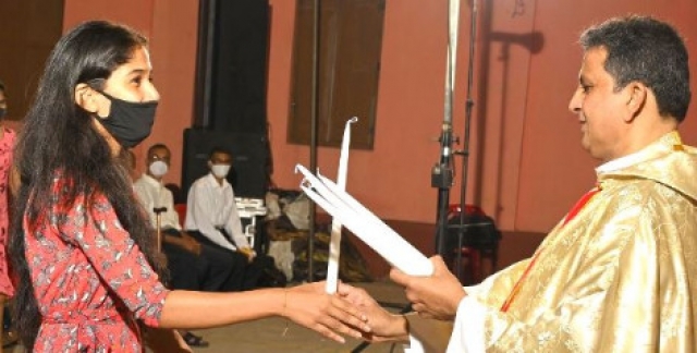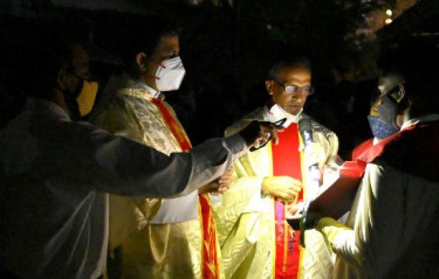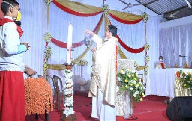 The Easter vigil was celebrated at Derebail church ground on April 3rd, 2021 at 7 pm. Rev Fr Victor George D’souza the Chancellor of Mangalore Diocese was the main celebrant, Parish Priest Rev Fr Austin Peter Peres and Resident Priest Fr Gerald Pinto were the concelebrants. Just before the festive mass, the faithful waited for the parish priest to light the Easter candle from the “new fire.” The Pascal candle was then taken by a procession along the aisle while parishioners lit candles from the flame, filling the entire church with candlelight.