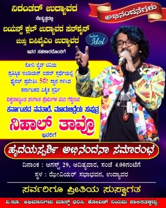 ಉದ್ಯಾವರ : ಆತ್ಮೀಯ ಮಾಧ್ಯಮ ಮತ್ತು ಪತ್ರಕರ್ತ ಮಿತ್ರರೇ, ಸೋನಿ ವಾಹಿನಿಯ ಪ್ರತಿಷ್ಠಿತ ಇಂಡಿಯನ್ ಐಡಲ್ ಸ್ಪರ್ಧೆಯಲ್ಲಿ ಫೈನಲ್ ಪ್ರವೇಶಿಸಿ 5ನೇ ಸ್ಥಾನ ಗಳಿಸಿದ ಕರ್ನಾಟಕದ ಏಕೈಕ ಸ್ಪರ್ಧಿ, ವಿಶ್ವದಾದ್ಯಂತ ಸಂಗೀತ ಪ್ರೇಮಿಗಳ ಮನ ಗೆದ್ದಿರುವ ಕರ್ನಾಟಕ ನವತಾರೆ, ಮೂಡುಬಿದ್ರೆ ಅಲಂಗಾರಿನ *ನಿಹಾಲ್ ತಾವ್ರೊ* ಇವರನ್ನು, ನಿರಂತರ್ ಉದ್ಯಾವರ ಇವರ ನೇತೃತ್ವದಲ್ಲಿ ಲಯನ್ಸ್ ಕ್ಲಬ್ ಉದ್ಯಾವರ ಸನ್ ಶೈನ್ ಹಾಗೂ ಐಸಿವೈಎಂ ಉದ್ಯಾವರ ಇವರ ಸಹಕಾರದೊಂದಿಗೆ *ಅಗಸ್ಟ್ 29, ಆದಿತ್ಯವಾರ ಸಂಜೆ ಗಂಟೆ 4.30ಕ್ಕೆ(ಸರಿಯಾಗಿ) ಉದ್ಯಾವರ ಸಂತ ಫ್ರಾನ್ಸಿಸ್ ಕ್ಸೇವಿಯರ್ ದೇವಾಲಯದ ಸಭಾಭವನದಲ್ಲಿ ’ಅಭಿನಂದನಾ ಸಮಾರಂಭ’* ಏರ್ಪಡಿಸಲಾಗಿದೆ.