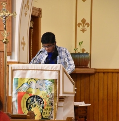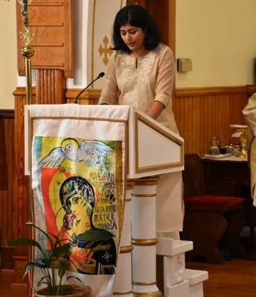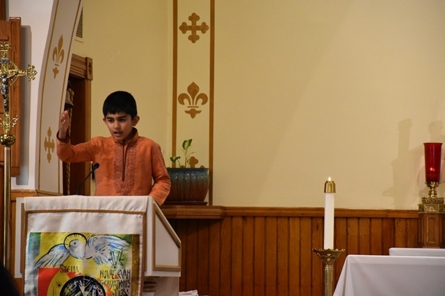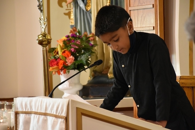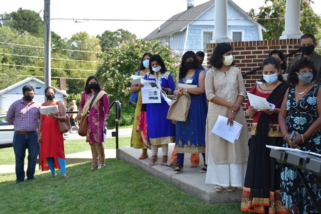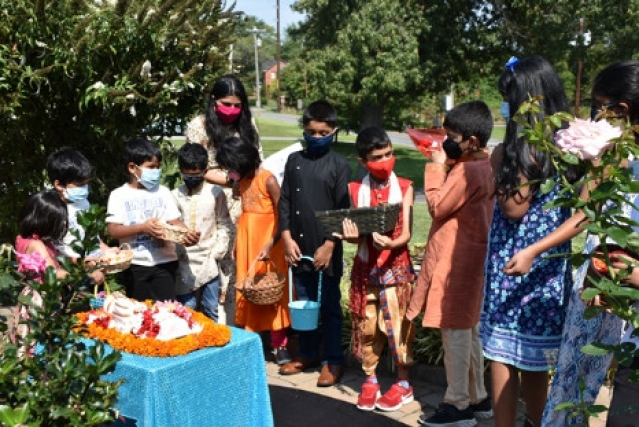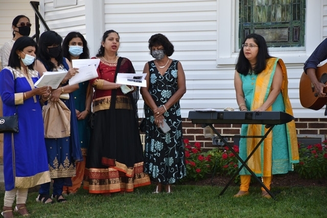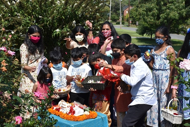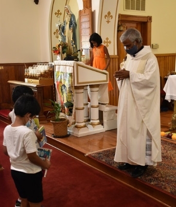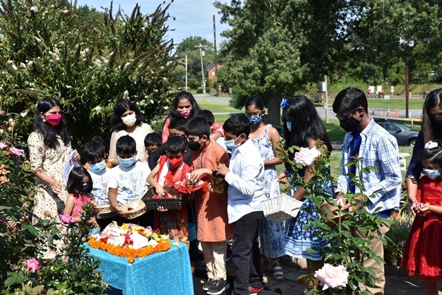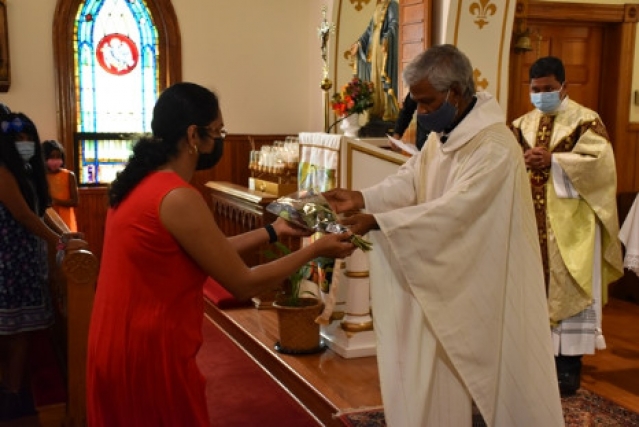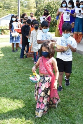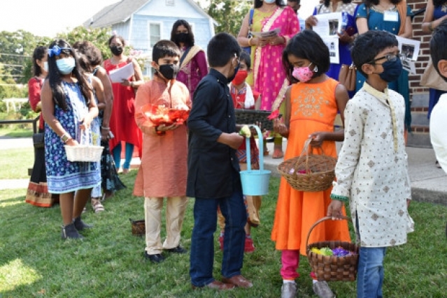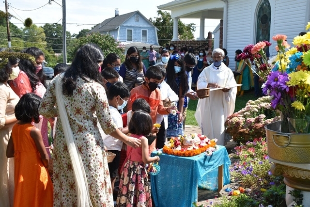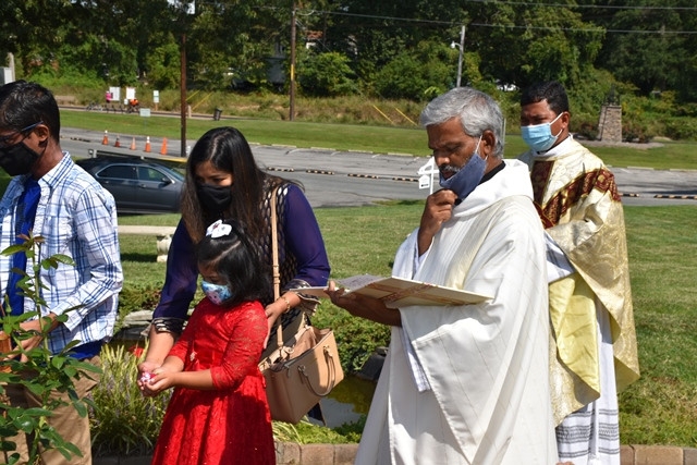 As announced earlier, MCA DMV took all the precautions to hold the event by practicing social distancing, adhering to the local guidelines and wearing masks, as needed, to keep families safe. The MCA Committee Member Nirmala Pinto the MCA Treasurer Nicole Racadag took care of registration of members and guests as they came in. The service began with the veneration of Infant Mary at the Church’s outdoor grotto at 11:15 a.m. While the men and women arrived in traditional Indian attire, the children lined up outside the church carrying flower baskets with fresh flowers from their gardens to venerate baby Mother Mary. The choir was led by MCA Vice President Clint Almeida and MCA Secretary Reynel Castelino, with Malin Mendonca giving accompaniments on the keyboard and guitars for the Konkani hymns ‘Sokkad Sangatha Melyan’ and ‘Moriyek Hogolsiyan.’ Fr. Brian Coelho, the Parish Priest of St. Mary Star of the Sea Catholic Church and Fr. Tony D’Souza, Parish Priest of St. Francis Xavier Catholic Church in Washington D.C., blessed the children and the ‘Noven.’