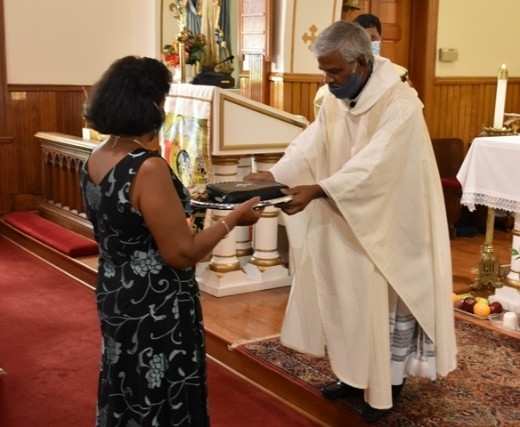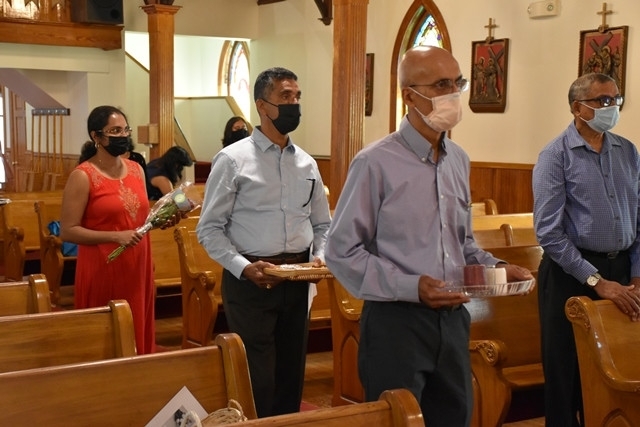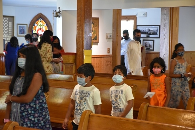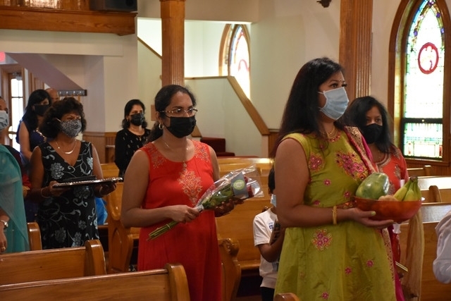 Then, the priests led the procession of attendees into the Church for the Mass. The Mass brochure, outlining the program and hymns, was designed and distributed by Merlyn Mathias, MCA Committee Member, prior to the service. The Mass was delivered in both Konkani and English, with the hymns being sung mostly in Konkani. During the Mass, a special tribute was paid to the 2,977 lives lost on Sept. 11, 2001, to the terrorist attacks in New York, Pennsylvania, and Washington, D.C. The choir team sang as families with children lined up for the offertory reading with various gift items, as per tradition. At the end of the Mass, MCA President V James Dante thanked the members for their attendance and participation, despite the challenges presented by the ongoing pandemic.