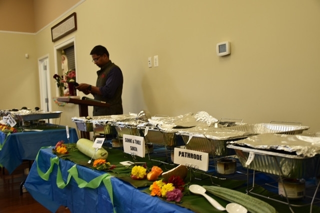 The attendees then proceeded to the Church Hall, which had been decorated by MCA volunteers. The dinner tables were decorated with banana leaves and other traditional display items by Anil and Priscilla D’Souza. Joe Pinto had managed the kitchen and kept the food warm, while the Mass was being celebrated. Fr. Brian Coelho blessed the traditional ‘Noven Jevon,’ prepared by MCA families, and everyone began feasting on a menu that included Sambar, Pathrode, Moong curry, Bende Sukkha, Sono and Tendli Sukkha (Black Channa), Sango (Beans), Karam (cucumber and coconut mix), rice and pickle. The meal was topped off with the delicious, traditional Mangalorean dessert, ‘vorn.’