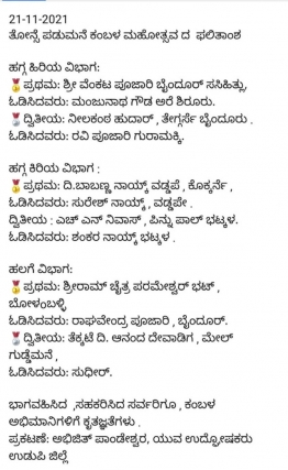 The Thonse Padumane kambla has attracted participants from all over the coastal area of undivided South Kanara and even as far as from the northern parts of Kerala. Lots of Kambala lovers visted and enjoyed the day long fun filled buffalo race. All participants were honored with gift and Winners were honored with Cash prizes.