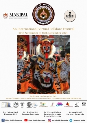 Manipal, 25th Nov2021: The virtual folklore festival, titled ‘MAHE Deakin Jana-Pada’, is an attempt to celebrate, educate, investigate and create an awareness regarding the processes of cultural preservation and cultural change and is supported by Indian Council of Cultural Relations, Regional Office Benlaguru, Consulate General of India, Melbourne, Australia, Association Nationale Cultures Du Monde (ANCM) Gannat, France, International Dance Council, UNESCO, Zorenka Dance Association, Pensa, Russia, Mythic Society, Begaluru, India, Karnataka Chalanachitra Academy, Bengaluru, India, La Danza Integradora de Culturas, Bolivia.