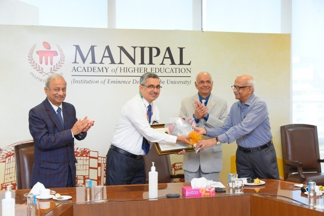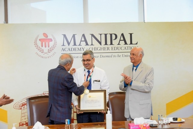 Manipal : Mr. Suresh Shenoy, Chief Manager – HR, Kasturba Hospital, Manipal Academy of Higher Education, Manipal has been featured in the India Book of Records 2022 for maximum number of Collage Art Works in a day. He has completed 10 unique collage art works within 6 hours and 30 minutes. MAHE Manipal honoured him on January 14, 2022 in the presence of Dr. H.S Ballal, Pro Chancellor, Lt. Gen. M.D. Venkatesh, Vice Chancellor, Dr. H. Vinod Bhat, Executive Vice President and former VC, Mr. Nishith Mohanty, Group President – HR & Academia, MEMG Bengaluru, Pro Vice Chancellors, Registrar, Senior Leadership of Kasturba Hospital and other Officials of MAHE.