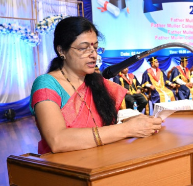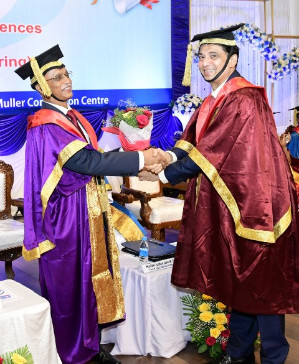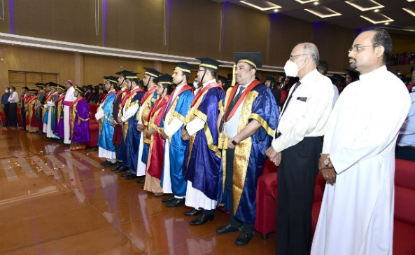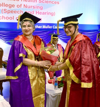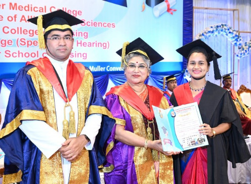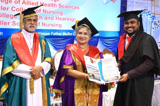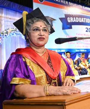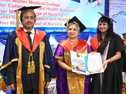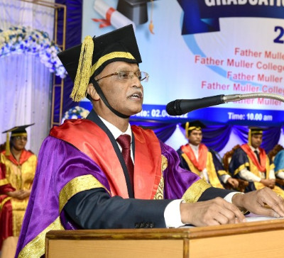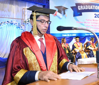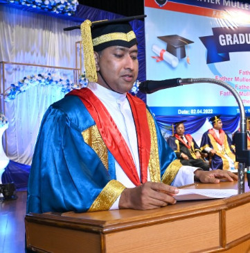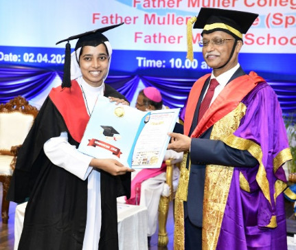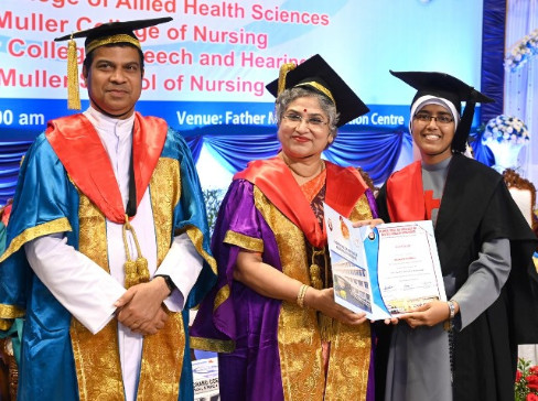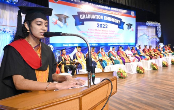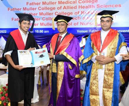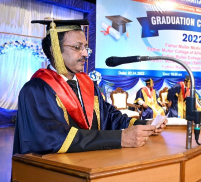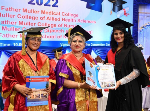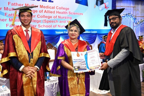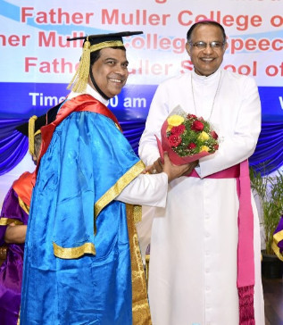 A total of 615 graduands from various education units of FMCI became graduates and took their oath in their respective professional code of conduct. Degrees were conferred to Father Muller Medical College (FMMC) for 147 MBBS., 82 PG Degree, 1 PhD, I MCh (Urology), 8 MPT, 41 BPT, Father Muller College of Allied Health Sciences (FMCOAHS) 11 Msc MLT 11, MHA 23, BSc MLT 31, BSc Mit 24, BSc RT 7, Father Muller College (Speech and Hearing) 32, Father Muller School of Nursing GNM 54, and Father Muller College of Nursing BSc Nursing 93, PBBSc 51, and MSc Nursing 9.