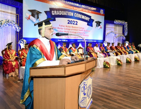 Dr Peter Paul Saldanha, bishop of Mangalore diocese, president - Father Muller Charitable Institutions in his presidential address focused on the word ‘empathy’ and how it differs from sympathy. He requested that though it might sound as though a pessimist is speaking, the world knows better of a doctor and a nurse. The loss of empathy has derailed the medical and paramedical profession and thus it is up to the new budding doctors to instill the healing and comforting nature of a true healthcare worker in the minds of the public.