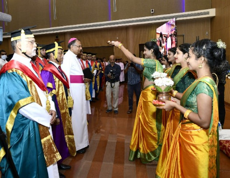 Mangaluru, Apr 2: ‘The world’s big things only can be done by paying attention to their humble beginning’ was the quote which was the background for this year’s grandeur graduation ceremony. The graduation ceremony which was held on Saturday April 2, paid first tribute to the founder Fr Augustus Muller SJ. For the last two years, due to the pandemic, the graduation of each college was done separately due to the public gathering restrictions thus was the reason the graduation ceremony was a subdued affair.