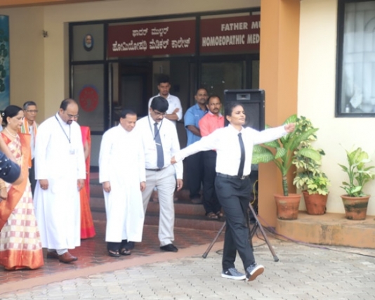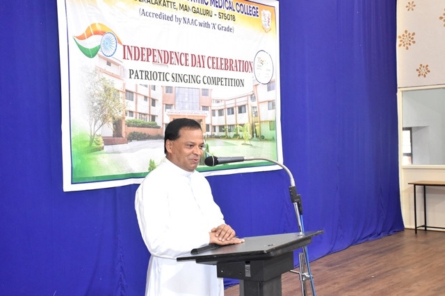 The independence day celebration commenced by imploring the blessings of the Almighty through a melodious invocation by Ms Santa Maria and team. Dr E S J Prabhu Kiran, Principal, Father Muller Homoeopathic Medical College welcomed the gathering and introduced the Chief Guest Rev. John Vas, Chaplain, Father Muller Homoeopathic Medical College and Hospital.
