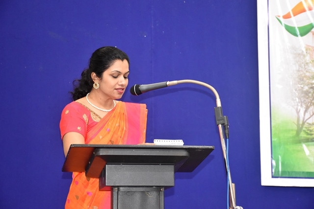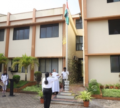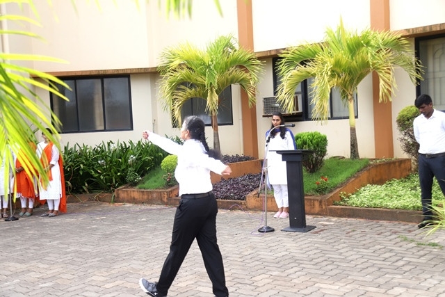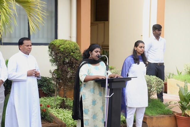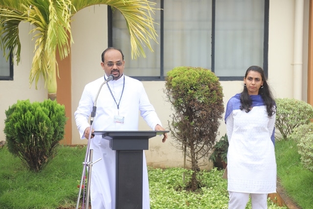 Miss Madhuri invited the Chief Guest to hoist the national flag. Flag hoisting ceremony was followed by the address of Chief Guest, Rev. Fr John Vas. In his message, conveyed that India chose to bring freedom not through gun and sword but through Ahimsa. Indian’s convey message to the world that we work through love and sacrifice that has been inculcated in us through our freedom fighters. He emphasized that Swasth Bharath can only be Sampann Bharath where health of every individual is given prime importance and every citizen receives his due respect in the form of justice and livelihood. We need to remember and cherish the sacrifices of our freedom fighters and take pledge to contribute our might to uplift our nation.