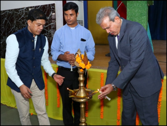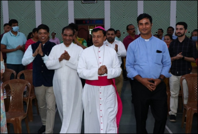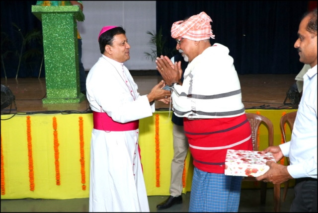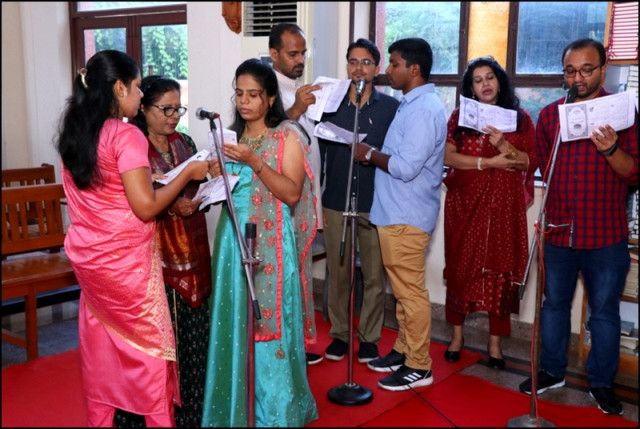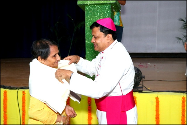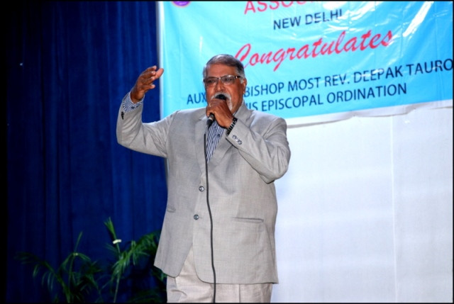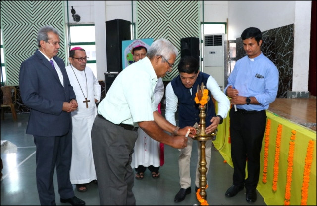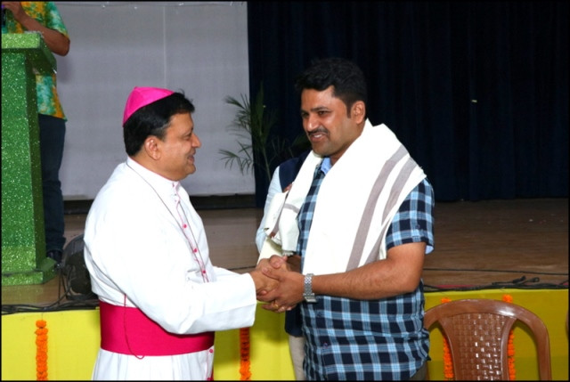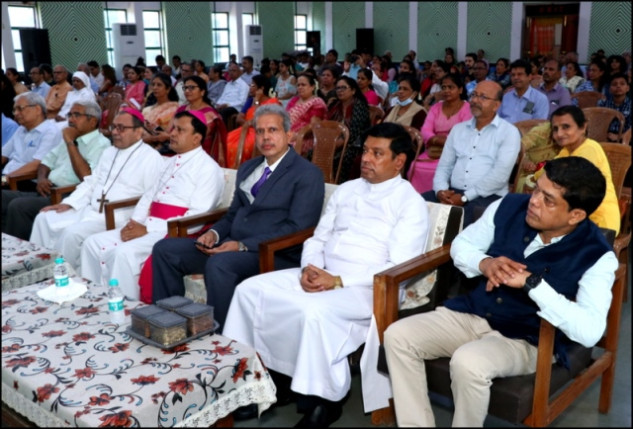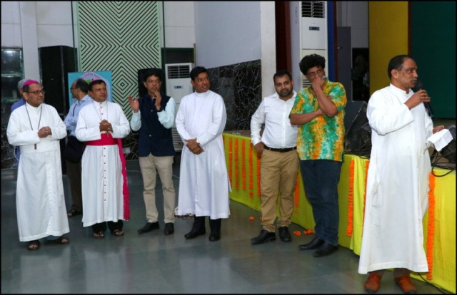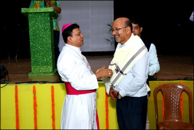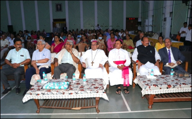 With traditional music all guests were welcomed to the auditorium. Auxiliary Bishop Rev. Deepak Tauro, Arch Bishop Emeritus Rev. Vincent Concessao, Fr. Anthony, Mr. Pius Monteiro, Mr. Maxell Pereira, former joint Police Commissioner Delhi , Mr Joslyn Martin Ex-Vice President of KCA, and Mr Ronald D’Souza, Executive Director of Shri Ram capital fund, lit the lamp to signify the commencement of the auspicious event. This was accompanied by a soulful song by a group of young seminarians. The President, Mr. Pius Monteiro formally introduced and welcomed each guest, after which Mrs. Ida Rodrigues informed the audience about the life and achievements of Bishop Deepak.