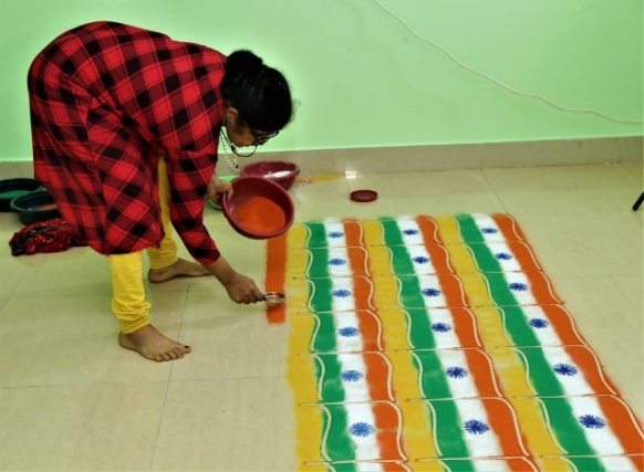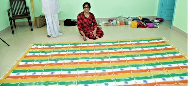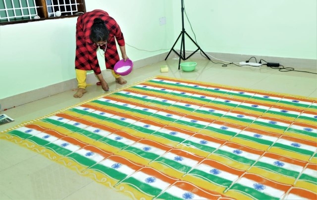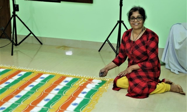 ರಂಗೋಲಿಯಲ್ಲಿ 76 ನಿಮಿಷಗಳಲ್ಲಿ 76 ರಾಷ್ಟ್ರಧ್ವಜ ವಿಶ್ವದಾಖಲೆ-ಡಾ.ಭಾರತಿ ಮರವಂತೆ