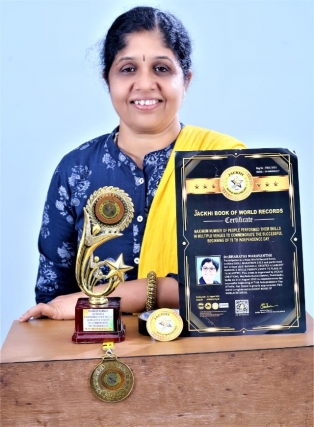 ತಮಿಳುನಾಡಿನ Mayiladuthurai ಜಿಲ್ಲೆಯಲ್ಲಿ ಜಾಕಿಬುಕ್ ಆಫ್ ವರ್ಲ್ಡ್ ರೆಕಾರ್ಡ್ ಸಂಸ್ಥೆಯವರು(ಜಾಕಿ ಕ್ರಿಯೇಶನ್ಸ್) ಆಯೋಜಿಸಿದ ಭಾರತದ 75ನೇ ಸ್ವಾತಂತ್ರ್ಯ ಅಮೃತ ಮಹೋತ್ಸವದ ಅಂಗವಾಗಿ 76 ನಿಮಿಷಗಳಲ್ಲಿ 76 ಭಾರತದ ರಾಷ್ಟ್ರಧ್ವಜಗಳನ್ನು ರಂಗೋಲಿಯಲ್ಲಿ ಬಿಡಿಸುವ ದಾಖಲೆಯಲ್ಲಿ ರಂಗೋಲಿ ಕಲಾವಿದ ಡಾ.ಭಾರತಿ ಮರವಂತೆಯವರು ಸಂಪೂರ್ಣ ಯಶಸ್ವಿಯಾಗಿದ್ದಾರೆ.