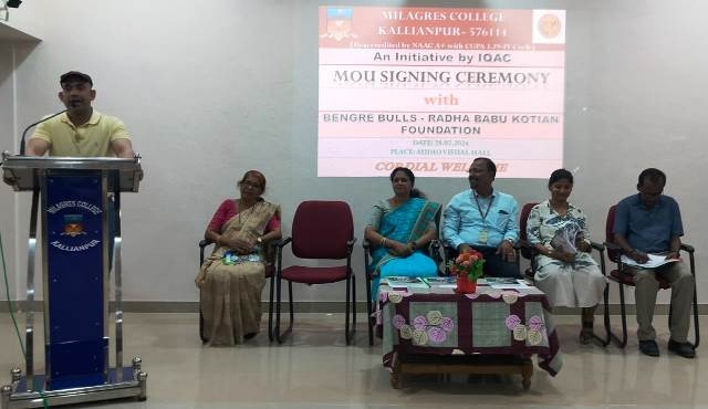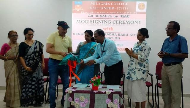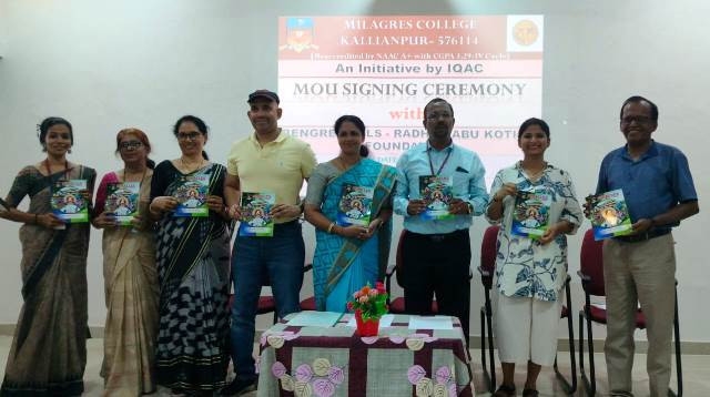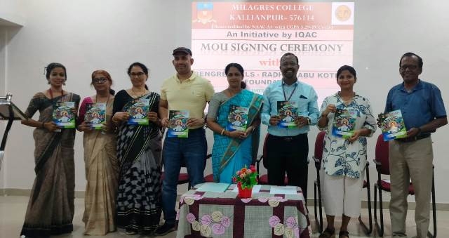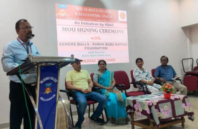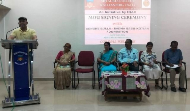 It’s an historical day in the life of Milgres College, Kallianpur Udupi said Dr Vincent Alva, the Principal of the college. He was speaking after signing a MoU with a renowned NGO the Radha Babu Kotian Foundation, Bengre an organisation serving the society in various ways especially in the field of sports in the AV Hall of the College at 10.30 am today.